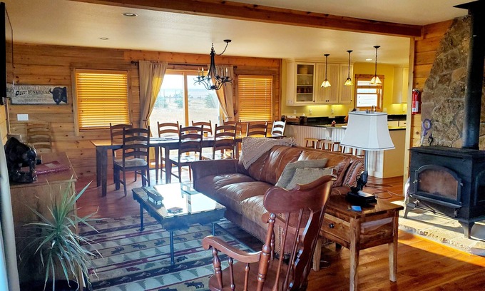Built in 2008, the lodge sits on our family owned and operated bison ranch in Coalmont, CO. We are about 1/2 an hour SW from Walden & minutes away from Routt County National Forest. Excellent fishing and hunting. Ideal home base for snowmobilers and ATV enthusiasts. Nearby trails are minutes away so trailer out or leave directly from the ranch. Plentiful hiking trails and camping sites as well. Enjoy world class skiing or go for a soak at the hot springs in Steamboat Springs, just 50 minutes away. In late summer and early fall, take a scenic drive over Buffalo Pass. The fall colors are spectacular when the leaves are at their peak. Wildlife viewer and birdwatchers' paradise! Moose, elk, deer, antelope, and eagles are frequently seen in the area. The Rabbit Ears are visible on a clear day. Enjoy your coffee while watching our buffalo roam!