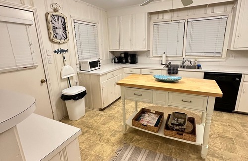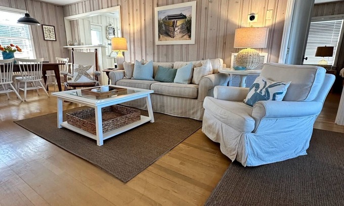 Step inside to discover an array of amenities designed to enhance your stay. The home features three bedrooms upstairs, each equipped with smart TVs, ensuring entertaining options for everyone. Two full bathrooms provide convenience for larger groups, while a cozy living room with a pull-out queen sofa adds extra sleeping accommodations. The fully equipped kitchen is perfect for preparing meals to enjoy together at the dining table, which comfortably seats six, plus two additional bar stools. Experience breathtaking sunrises and sunsets from one of the many windows or sip morning coffee on the outdoor porch—ideal for pre-wedding moments or intimate gatherings with loved ones.