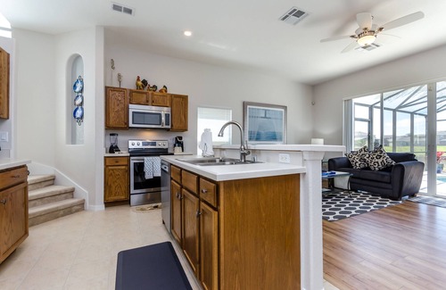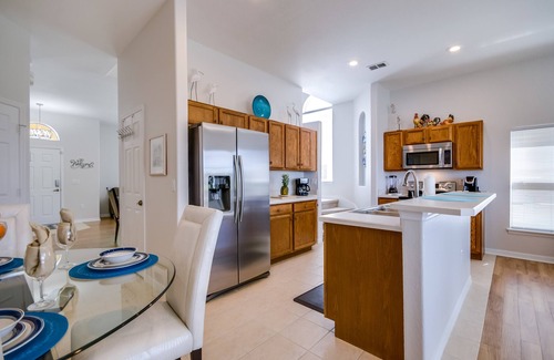 Welcome to the Sunset Villa Resort in Marbella North, one of central Florida’s premier gated resort communities. Ideally located just minutes away from the Disney theme parks, our home provides everything you’ll need on your next trip to the Sunshine State. As you enter our home, you’ll be greeted by a sense of luxury, relaxation and tranquility. Soaring vaulted ceilings and an open concept layout provide the perfect setting for leisure and entertainment.