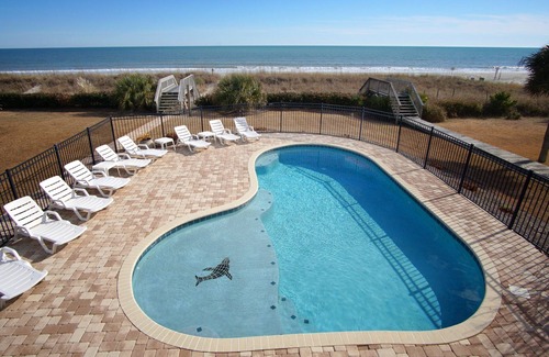 This 7 bedroom, 5.5 bathroom oceanfront home located in southern Myrtle Beach has been recently renovated and features a private pool and magnificent views of the ocean from all over the house. This 2 story home features a private pool, large patio & deck area, gas grill, private beach access with shower, 2 fully equipped kitchens, Wi-fi internet access, and beautiful views of the beach and ocean from many rooms and the upstairs balcony.