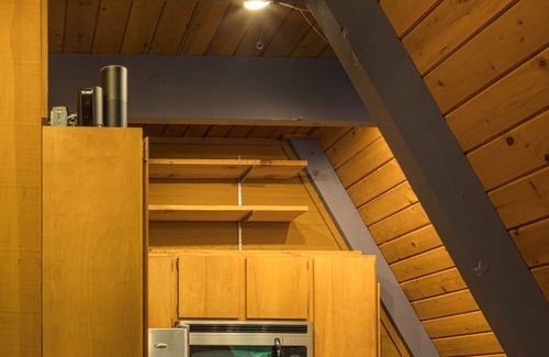 Upstairs is the open sleeping Loft - this space is open to Living/Dining below but the high ceilings give this room privacy. The loft sleeping room has a king size bed and a 1/2 bath with small sink and toilet behind privacy wall. You feel like you are sleeping in a treehouse in this room! Access to the Loft via a steep open stair, not suitable for small children.