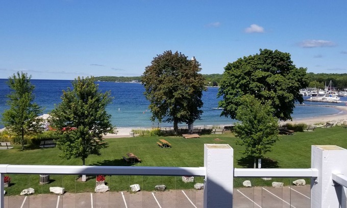 This condo is for adults only. Condo has high end furnishings, stainless steel appliances, quartz counter tops, gas fireplace, vaulted living room ceiling, fantastic water view, and walking distance to all the best restaurants in Sister Bay. Listen to the waves while enjoying the beach view from the large deck! It's the perfect spot to relax and watch boats going in and out of the marina. You can also see and hear live music from the amphitheater or simply enjoy the atmosphere of everything going on in Sister Bay. *Parking for 2 vehicles (one large SUV or 2 smaller vehicles parked tandem).