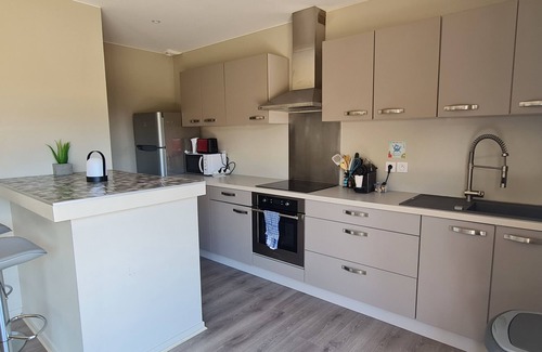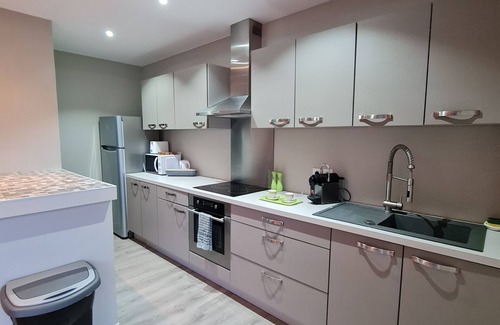 => a spacious open-plan kitchen with bay window also opening onto the terrace + bar area, fitted and equipped with a washing machine, dishwasher, 3-ring ceramic hob, oven, extractor hood, microwave, coffee machine, kettle, toaster, etc.