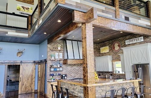 Here at McNutt Cabin, you will find a beautiful two story home setting on 175 ac. 5 miles southeast town. The cabin has amazing views of the sun setting on the lake every evening. You can enjoy them outside in the 2 sitting areas or from the comforts of inside at the bay of windows in the front of the house. Inside you will find a fully furnished kitchen with a 6 burner stove with a griddle, double oven, dishwasher, wine cooler. A beautiful bar that will seat 8, and a custom built dining table that seats 8. The living room is open with 2 sitting areas that is very spacious. Our bunk room is not your average bunkroom it has 6 built in queen sized bunks that are built into the wall. they also are wired with usb ports and electric plugs in ea. bunk. We have 3 other bedrooms that are huge and set up for you to relax and unwind. The bathrooms are awesome , they have custom showers and unique vanities. We also have a gameroom with a out of this world designed bar, console arcade, foosball table, and KARAOKE MACHINE!! In our utility room you will have access to a commercial ice machine and washer and dryer.