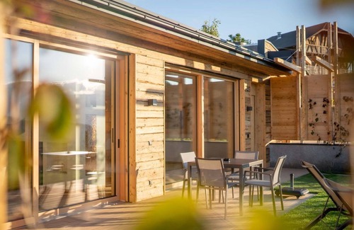 The exquisite chalet No. 4, which is part of the Aura Chalets, is situated in Kastelruth (Castelrotto) and offers everything you need for fantastic holidays full of peace and relaxation in the scenic landscapes of South Tyrol. The 65 m² holiday home consists of a living room with a sofa bed, a well-equipped kitchenette with a dishwasher next to a dining table, a bedroom with a glass ceiling and a freestanding bathtub as well as one bathroom with a rain shower and can therefore accommodate 4 people. Additional amenities include Wi-Fi, a fireplace and satellite/cable television. The floor-to-ceiling glass windows in both the living room and the bedroom guarantee spectacular panoramic views over the surrounding meadows and mountains and separate the apartment from the lush private garden with seating furniture and sunbeds. Here you can start the day with a hearty breakfast or spend the evenings with a glass of wine and delicious home cooked dinners. From the property, it is only a 4-minute drive or 2.7 km to the centre of Kastelruth (Castelrotto), where you will find supermarkets, shops, a bakery, a pharmacy and restaurants serving South Tyrolese dishes. Many hiking and cycling routes start from the town, and a 19-minute drive (13 km) from the apartment, the famous skiing area Seiser Alm (Alpe di Siusi) boasts brilliant slopes. South Tyrol’s lovely capital city of Bolzano is located a 41-minute drive or 29 km southwest of Kastelruth (Castelrotto).