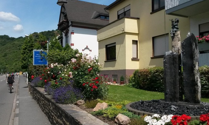 The modern apartment (about 38 sqm) can accommodate two people and is equipped with high quality. It has a fully equipped kitchen with dishwasher and dining area, a bathroom with tub and a tasteful living / sleeping area. A high-quality box spring bed (double bed) and a large couch (extendable as additional sofa bed), granite tiles and satellite TV complete the facilities. A balcony with a view of the Rhine is also available. The apartment has been completely renovated and refurbished. The Rheinsteig and the ferry to Bopparad are within walking distance. Many sights in the World Heritage Middle Rhine Valley are easily accessible (Loreley, Rüdesheim, Marksburg, Koblenz). Shops (Lidl, pharmacy) are in the immediate vicinity. Parking is possible around the corner at Lidl free of charge. Luggage can also be unloaded in the yard. Behind the house is a beautiful garden with apple trees and a fishpond. Bicycles are available for free.