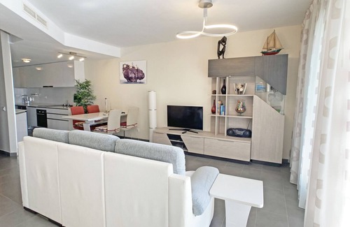 The apartment has got two bedrooms, one of them with en-suite bathroom with walking shower, a toilet, an airy and bright living room with a fully equipped open plan kitchen with galley area. The living room has got access onto a lovely big terrace with sea views.