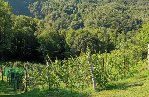 Val Bregaglia: Agriturismo 430 m a.s.l 2 storeys, semi-detached, renovated, surrounded by trees, meadows and vineyards. 3 apartments in the property. In the hamlet Borgonuovo, 400 m from the centre, 4 km from the centre of Chiavenna, 23 km from the centre of Madesimo, in a quiet, sunny position, 23 km from the skiing area, directly by the stream, south facing position. For shared use: park, garden (not fenced) with lawn and plants, meadow, orchard. Garden furniture, barbecue house. Bumpy motor access (50 m via unmade road). Parking at the house. Supermarket 4 km, restaurant, bar 400 m, railway station "Chiavenna" 4 km, sandy beach "La Punta (Sorico, Lago di Como)" 30 km. Walking paths from the house, cycle lane 100 m. Nearby attractions: Cascate dell' Acquafraggia 400 m. Well-known ski regions can easily be reached: Madesimo 23 km. Well-known lakes can easily be reached: Lago di Mezzola 19 km, Lago di Como 30 km. Hiking paths: Sentiero Storico di Fondovalle, Traversata dei Monti, Sentiero Panoramico di Bregaglia. Please note: animals in the neighbourhood. All houses/apartments are individually designed/furnished.