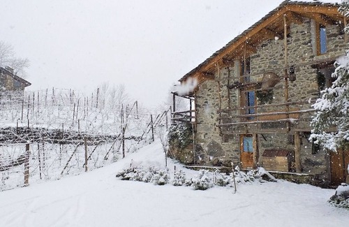 "Fienile nel Vigneto", 2-room apartment 40 m2 on 2 levels, on the upper ground floor. Fully renovated in 2019, stylish and wooden furniture furnishings: open living/sleeping room with 1 sofabed. Exit to the garden, to the terrace. Kitchenette (2 gas rings). On the lower ground floor: 1 open double bedroom with wood-burning stove. Shower/bidet/WC. Heating. Wooden floors. Terrace furniture. Very beautiful panoramic view of the mountains, the valley and Cascate dell' Acquafraggia. Facilities: hair dryer, logs (extra). Please note: non-smokers only. Maximum 1 pet/ dog allowed. Private entrance.