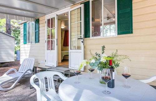 Child friendly resort "Belvedere Pineta Camping Village 4*". 173 houses in the resort. In the district of Belvedere 6 km from the centre of Aquileia, 7.5 km from the centre of Grado, direct access to the beach, direct access to the lagoon. For shared use: natural state property 50 ha (fenced) with trees, swimming pool (25 x 12 m, seasonal availability: 01.May. - 21.Sep.). Children's pool, tennis (extra), table tennis, boccia, volleyball (extra), beach volleyball, children's playground. In the complex: restaurant, bar, bistro, WiFi (extra). Shopping facilities, kiosk, washing machine, tumble dryer (for shared use, extra), bicycle rental. Supermarket 6 km, railway station "Cervignano del Friuli" 14 km. Marina 7.5 km, cycle lane 1.3 km. Nearby attractions: Trieste 56 km, Riserva Naturale della Foce dell'Isonzo 20 km, Castello di Duino 32 km, Aquileia 6 km. Please note: entertainment in the season. Suitable for families. Obligation to wear bathing caps.