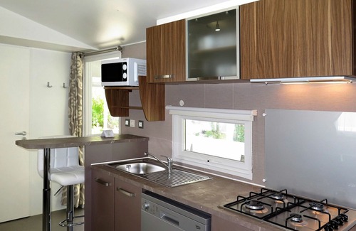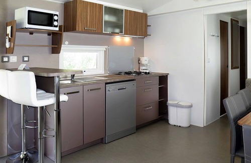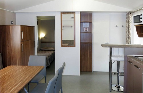 The Perla is a 3-room mobile home with a total area of 31 square meters. It is suitable for accommodating 5 adults and 2 children, featuring modern furnishings. The living/sleeping room is equipped with a double sofa bed and a dining table, leading to a veranda through an exit. Additionally, there is one double bedroom and another room with one bed and one bunk bed for two individuals. The kitchenette is well-appointed with a dishwasher, four gas rings, a kettle, a microwave, a freezer, and an electric coffee machine.