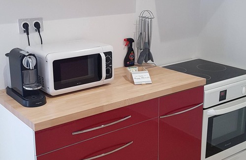 The kitchen is equipped (induction hob, dishwasher, Nespresso coffee machine, kettle, microwave, oven, fridge).