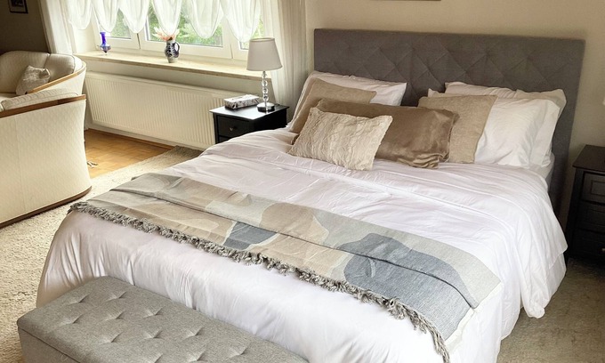 Beautiful house with a large attic apartment in a central location with a large garden, terrace, balcony with beautiful garden furniture. This apartment has a fully equipped kitchen (e.g. coffee machine, microwave, oven, kettle, and toaster) with Miele washer-dryer and extendable table. There is also a large living-bedroom with TV and Wi-Fi internet with a beautiful panoramic view. The new, very comfortable beds offer very comfortable space for 5-7 people. There is 1 king size bed, 2 queen size beds and a single bed in 4 different rooms. All rooms have lamps with USB charging options for cell phones or iPads. All linens are provided. The bathroom has a bathtub and shower and is equipped with towels. The hallway and the entire apartment are decorated with beautiful art and items from the region. There is also space in the hallway to lounge on one of the beautiful sofas. On the 2nd floor there is a large balcony, which can also be used. In addition, the large garden is available to the neighbor for relaxation. All shops for daily needs, restaurants and village festivals are within walking distance. There are parking spaces directly in front of the house. Larger cities with supermarkets, restaurants and all services and cultural offerings (e.g. Bayreuth Festival) can be reached by car in 10 to 30 minutes. There is information material about the region in the living room.