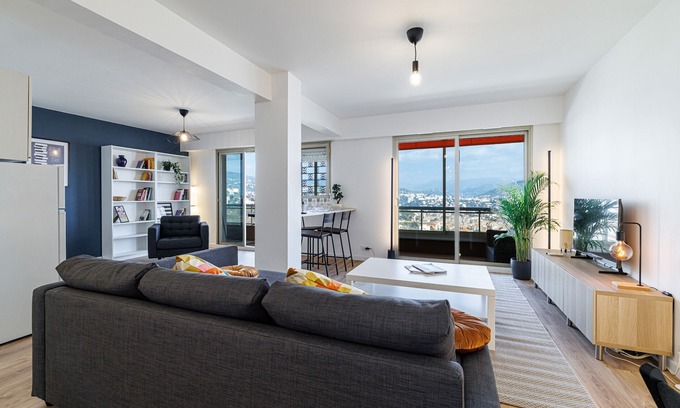 We offer for rent this very beautiful spacious apartment, ideal for a couple perched on the heights of the city of Nice.The apartment is located on the ground floor of a secure residence overlooking the Riviera capital.The accommodation is arranged as follows:- You enter the bright living room with several bay windows to benefit from a bird's-eye view of the city, this room is fully air-conditioned.- This room includes a lounge area with sofa, armchair, Smart TV, free WiFi connection, it also has a desk as well as a dining area with high table & chairs.- From the living room, you have access to the veranda with table & chairs to enjoy the view while being sheltered from any bad weather!- The kitchen is open to the living room and fully equipped with dishwasher, oven, microwave, Nespresso coffee machine, kettle, electric hotplates.- You will also have a separate bedroom with a standard size 140x190 double bed & large storage cupboards. From the bedroom you can easily access your terrace to enjoy sunbathing! The bedroom has an adjoining bathroom including shower, vanity unit, washing machine & WC.The products that are made available to you during your stay are welcome products to facilitate your arrival, we do not guarantee that they will be sufficient for your entire stay.It is preferable to have a vehicle to move around easily during your stay, you will have a closed garage to park your car.