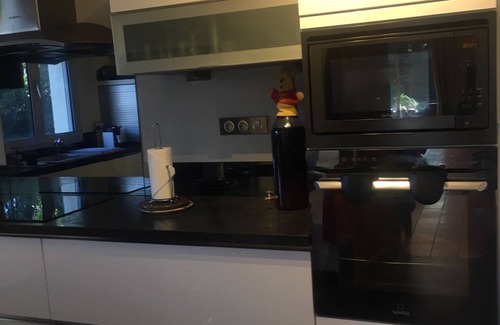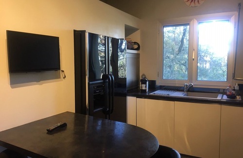 - the closed kitchen overlooks the dining room and the living room. It is contemporary in style with all the modern equipment needed: oven, microwave, induction hob, extractor hood, dishwasher, washing machine, American fridge and of course the dishes and other utensils needed such as a coffee machine. Nespresso coffee, kettle, robot ... etc ... There is also a small wall-mounted TV.