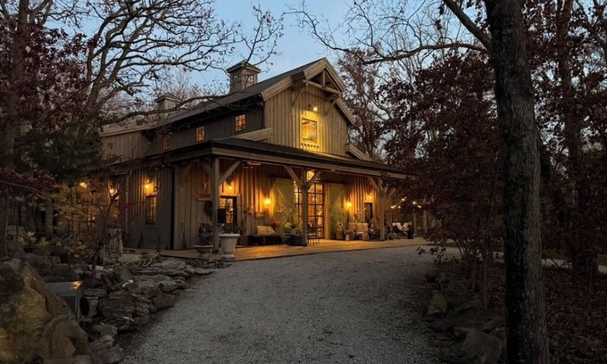 Timber framed barn home nestled in 23 acres of forest just minutes south of Kansas City. Beautiful 3 acre lake, walking trails, 3 large flat screen TV's, full kitchen, and much more. Perfect for an easy get away, or business traveler. Completely open floor plan, kitchen, 3 large flat screen TV's with Apple TV, Starlink Internet/Wifi, one full large bathroom, one 1/2 bathroom, Pool Table, Ping Pong, 3 acre lake, canoes, walking trails, trampolines, multiple outdoor patios. Upstairs in the barn includes a large bedroom/living area that includes 3 bunk beds, one queen bed, two single beds, and couches (8-10 available for sleeping). Additionally, we have an unattached cottage with two double beds upstairs, and a pull out bed downstairs (6 available sleeping). The property is secluded, peaceful and quiet.