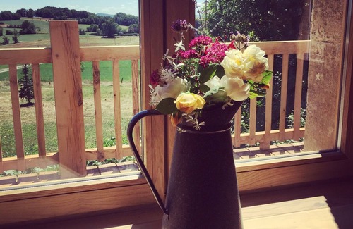 There is a large open plan kitchen with range oven, farmhouse sink, fridge, freezer and dishwasher. In the same open plan area is a large dining and living space with wood burner for winter nights and a large window and beautiful south-facing views. A television with UK satellite channels is available as is a Blueray DVD and media Player along with plenty of DVDs. Underneath the barn is a storage area for guests' cases, bikes etc as well as a washing machine.