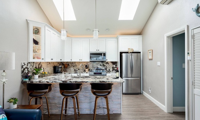Spacious new kitchen outfitted with seating for 2 at large granite bar and everything you need to cook a gourmet meal. You will delight in cooking in the new kitchen replete with every type of needed appliance, including, but not limited to coffee maker, coffee grinder, milk foamer for coffee, toaster, air fryer, blender, mini-prep food processor, rice maker, electric kettle, sharp knives and a complete set of dishes and cookware.