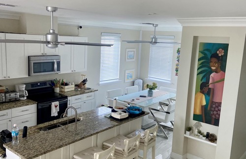 Our home is an end corner of 2,000 square feet on 2 floors offering several amenities that will make your stay more comfortable and pleasurable, including free Wi-Fi internet, full A/C, a 50" TV with cable and internet service, an outdoor BBQ grill, and most of all, a beautiful beach and turquoise waters to snorkel in just 3 steps down from the porch and right right next to the pool.