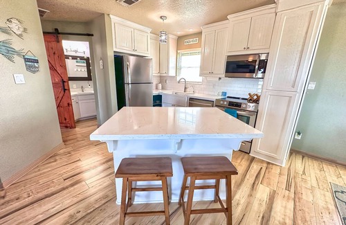 Come check out these 3 bedrooms plus loft and 2 full baths in a well-appointed 2 story beach cottage ready for your island and fishing excursions! Sleep up to 11 guests comfortably and located conveniently off Bluewater Highway near the Bay. Fat Grouper welcomes you with a private driveway right off the main road. Convenient location on an expansive corner lot with plenty of parking. Bring your boat, and park it at the house with easy access to the subdivision boat ramp just 2 blocks directly behind the house. You may enjoy crabbing at the neighborhood pier. Since the house sits along the county beach, you also have easy access by vehicle onto the sand or approx. 8-10 minute walk to the shores of the Gulf of Mexico! After getting your toes in the sand, enjoy the hot and cold water in the outdoor shower to rinse off and refresh. Beautiful water views and sounds of the ocean and waves while relaxing in custom deck chairs! Dedicated coffee bar with both styles of coffeemaker, whole house water filtration plus additional RO faucet in kitchen! Fat Grouper is ready for your family and friends!