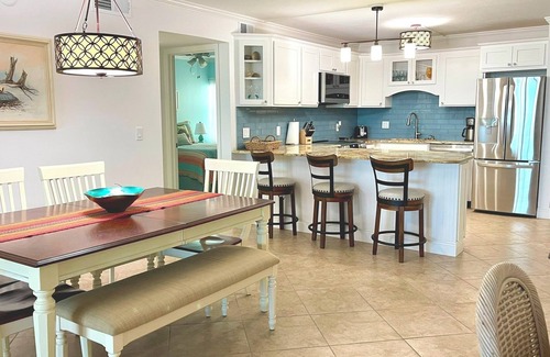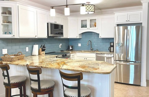 Cook in the spectacular kitchen with granite counter tops which is equipped with new stainless-steel appliances, and a vast assortment of bowls, cookware, gadgets, flatware and utensils to create that great beach meal. Attached and adjacent to your kitchen are a breakfast bar and dining table so family and friends can be together while meals are made in your kitchen away from home.