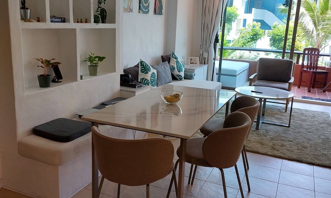 Located in Hua Hin Khaotao, this charming condo is a dream. With 2 cozy bedrooms featuring a king bed and a twin bed, guests will feel right at home. The property also offers 2 bathrooms equipped with a hairdryer and shower. The Condo offers a Fully equipped Kitchen for a long stay and a open living and dining room, This we call it the Drawingroom, leads to the sun-protected Balcony, which has a large lounge area. Whether you're looking to relax or stay active, amenities like Fiberglas WiFi, a fitness room, AC, and an iron are available for your convenience. We're happy to assist with any questions while you stay at our condo.