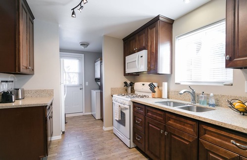 The guest house is completely recently remodeled. There are custom cabinets with quartz counters in kitchen and bathroom. Lovely porcelain tile floors (you would swear they were wood) throughout. The kitchen is fully equipped with everything you need to cook any meal and glassware for any kind of cocktail. There is a large 48" TV with full streaming available. Wifi is also available. It has it's own private, front entry and a lovely and tranquil private back yard with a wonderful fig tree and lots of flowers and bougainvillea pouring over the fences. Enjoy a cup of tea or coffee in the mornings or a glass of wine or cocktail in the evenings on your patio, which has quality and tasteful patio furniture. A stack-able washer/dryer is available inside for your convenience.