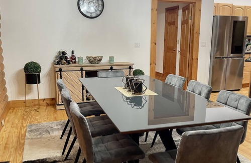 The dining area with a luxury table, that provides seating for 8.