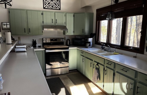 We just put all new floors in, January 2024, on the lower level - which is the bedrooms, TV room and spacious hallway leading to the laundry room and door to outside deck. (See pictures) This cabin comfortably sleeps 8. There is a queen bedroom, bedroom with 2 full size beds, 1 large sleeper sofa near fireplace and a leather futon in the sunroom facing the lake. The upstairs bathroom has been completely remodeled January 2025!