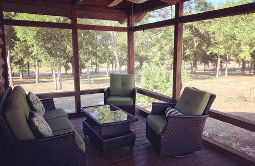 There are a few other cabins near by but this particular cabins stands on its own. We are surrounded by large farms and ranches so the view are very nice, and the feel is peaceful and relaxing! Guest can park directly in front of the cabin and are welcome to explore and use the many amenities of Son’s blue Rive Camp including chairs and umbrellas by the river’s edge, the numerous hammocks which are spread through he property, sand volleyball court, fire pits and more!