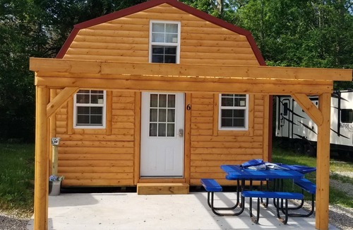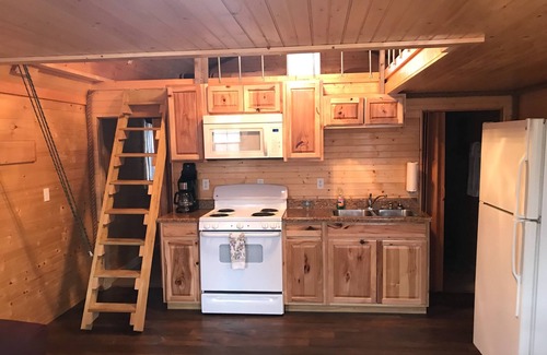 This unique country cabin features a full kitchen with a stove, oven, refrigerator, microwave and coffee pot. This unit has a full bathroom with walk in shower. The downstairs bedroom features a king sized bed while the split loft features a queen and a twin on each side. All linens are provided. There is a large grill for cooking out and plenty of room for a campfire. Maximum Capacity for this cabin is 8.