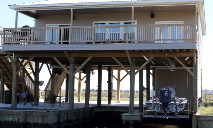 Our camp located on 409 Lake Breeze Rd in Hackberry Louisiana. We completed the build in the Spring of 2015. This is a 3 bedroom, 2 bathroom camp with all the amenities of home. The master bedroom has a queen bed. One guest room has 2 full beds. The remaining guest room has 2 sets of bunk beds, with the bottom being a full mattress and the top being a twin mattress on each bed. Each bathroom is complete with a full size shower and bathtub. The living room, master bedroom, and the bunk room have flat screen TVs. The camp is also equipped with surround sound in the living area, as well as speakers on the outside porch. The kitchen is equipped with a stainless steel refrigerator, oven, and dish washer. Our kitchen is stocked with all the essential items you may need to cook a delicious meal. We have a laundry room, complete with a front loading washer and dryer. Our outside porch is very spacious, overlooking the canal. We have an outdoor furniture set, large primo grill, tv, refrigerator and cook area to enhance your outdoor experience . Downstairs is another bbq pit and outdoor table with chairs. In addition, we have a two covered boat slips, one reserved for our guests. Our circular driveway allows an easy entrance and exit for boat trailers. We hope you enjoy your stay!