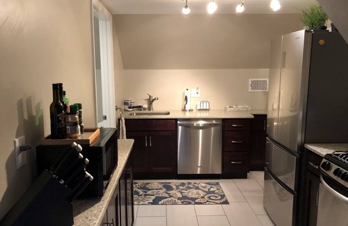 This newly remodeled 750 square-foot carriage house will provide you with your own separate "Home Away From Home" as you socially distance yourself from an uncertain world. Just across from the owner's home, it is your "City House in the Country". With 7 acres, many mature trees, a pond and quiet seclusion well off the road, you will feel like you are out in the country. It features a cozy bedroom with a pillow-top king bed, living room, full kitchen with quartz counter tops and stainless appliances. Custom bathroom with ceramic/mosaic tile, including washer and dryer-- it will provide you with everything you need for a comfortable stay. Bonus space included: Downstairs office / living space with queen size futon bedding included. An attached 1 car garage is also included. Parks for walking and biking are close by. A great escape nest for your getaway stay!