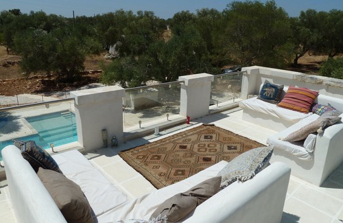 June to Sept TUESDAY TO TUESDAY rental to save you on flight costs. This holiday home has all the character of stone vaulted rooms and a conical trullo but with the convenience of a newly renovated, well insulated design. Very good unlimited wifi included. Modern bathrooms and kitchen with professional cooker. Look out from the veranda over the pool to the Agaves and Olive trees, or from the roof terrace, great for evening parties, to the Adriatic or the beautifully lit Carovigno and its castle. Seven minutes drive to Ostuni, the white city, "the jewel of Puglia" with its wonderful old city to explore by day or enjoy in the warm night air. Relax in old bars, or the sophisticated modernity melted into the solid stone. Carovigno has a lot to offer from gourmet to great value restaurants with fantastic food and low prices. Italians choose to holiday here. The veranda has an outside kitchen, popular in southern Italy, and we have two barbecues. The local fish, meat and vegetables are exceptional so you can go into town later and chill, or just watch the sun go down, poolside.