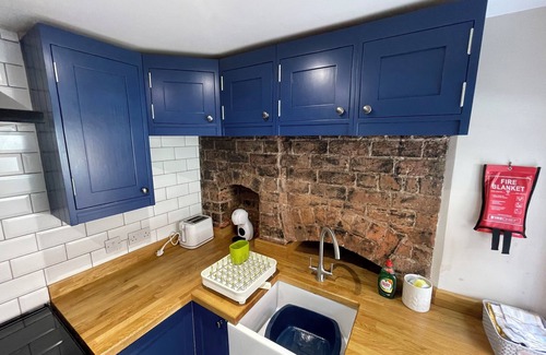 The kitchen is well equipped and fully fitted with a full-size fridge freezer, freestanding cooker, butler sink, and washer-dryer. Exposed brickwork reveals original features from circa 170 years ago. In the dining area, you'll find a log burner, dining table and comfortable seating. From the kitchen, you can access the delightful woodland garden. The garden is unfenced and neighbours have a right of way across the garden.