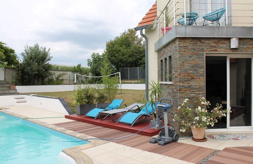 Our house is located in a beautiful Alsatian village with all amenities (restaurants, bakery, newsagent, farm products, doctor etc ....) 10 minutes from Strasbourg by car. The village is served by public transport (300 meters). A supermarket in the nearby village 2 minutes. The house is perfect for families with children. It is fully air conditioned, has a sauna, a gym with equipment for fitness and bodybuilding, a spa bath, a swimming pool heated by solar panels and a large terrace with barbecue and oven wood (pie outbreak pizza). The wine route begins at 10 km. The Vosges mountains are 45 minutes away, the mountains of the Black Forest (Germany) are 1 hour away and Switzerland at 1:15. Europe's largest amusement park (Europapark) is 45 minutes.