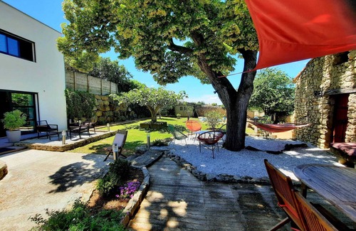 Exterior: very pleasant garden of around 400 m2, shelter with sink and barbecue, terraces and dining areas, pétanque pitch