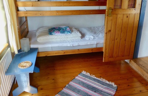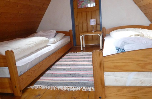 Covered terrace at the entrance, living room with large windows overlooking the sea, roof height fireplace room with kitchen and sleeping loft. Separate small bedroom for two people with a bunk bed (standard bed sizes, including individually put up. In the whole house wood floors and wood-beamed ceilings. The cottage is fully equipped for four people, even with towels u. Bedding. Usable all year (central heating on stove). Prices include energy costs, bed linen, towels, washing machines - and dryer use. Cleaning € 20.-. No additional charges // Prices for longer stays by arrangement. // Arrival in high season Saturday, otherwise by appointment.