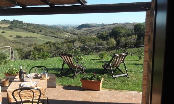 Single cottage in the Marche on one level completely independent, renovated in 2005, inside an ancient manor house, the romantic studio flat "IL MELOGRANO", furnished with care and style, located on the ground floor, has a double bedroom and bathroom with hydromassage, It is also equipped with independent heating, kitchenette, satellite television, a private veranda with table and chairs and everything you need to spend a pleasant romantic weekend in a farmhouse.