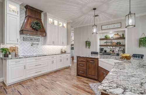 The house has 2 master suits, one upstairs, and one down. The downstairs master suite has an expansive curbless shower with 4 shower heads and 2 valves. A deep soaking tub under a chandelier is accompanied by an electric fireplace for the perfect ambience when you need to de-stress. Don't worry about running out of hot water; a tankless water heater provides endless hot water.