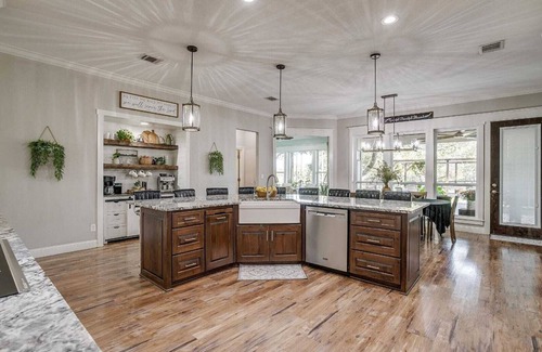 Beautiful country farmhouse ideal for family gatherings, retreats, or just a quiet getaway. It was designed for a large family with family gatherings in mind. The house has 3 common areas, the living room downstairs with a wood-burning fireplace, a second common area upstairs with both couches and a ping pong table, and a sunroom with lots of plants. Outside, you can relax on the rocking chairs on the front porch, hang out in the gazebo, or entertain on the patio. The eat-in kitchen has a large quarter-circle countertop with 9 barstools. The dining table is expandable upon request. One corner of the kitchen has a dedicated coffee station with coffeemaker, espresso machine, mugs, and condiments.