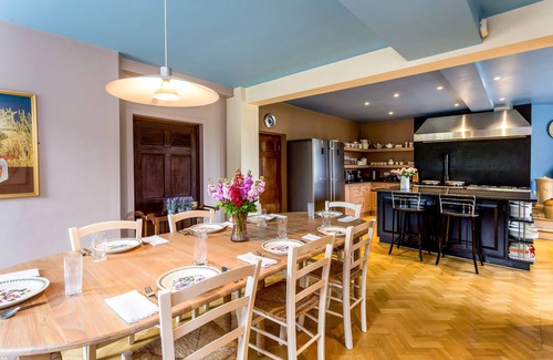 On the ground floor is a large, open-plan kitchen with breakfast room (stocked with everything you need including a nespresso machine for the perfect cappuccino), a well-appointed Georgian living room, and a beautiful historic panelled dining room seating 16.