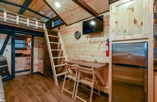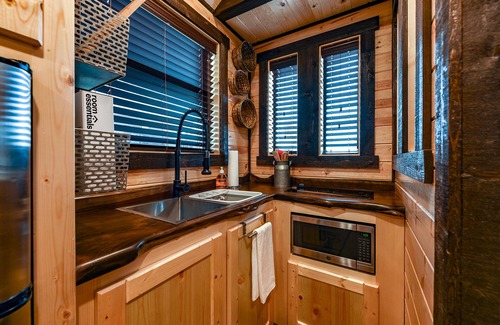 The tiny house has a comfortable queen size bed, downstairs has a full-sized futon, a spacious shower and bathroom with a regular sized sink and toilet, and a nice kitchen area. The home has a smart TV mounted on the wall in the living area that can be connected to your smartphone's hotspot to watch Netflix, Hulu, Amazon Prime Video, etc.