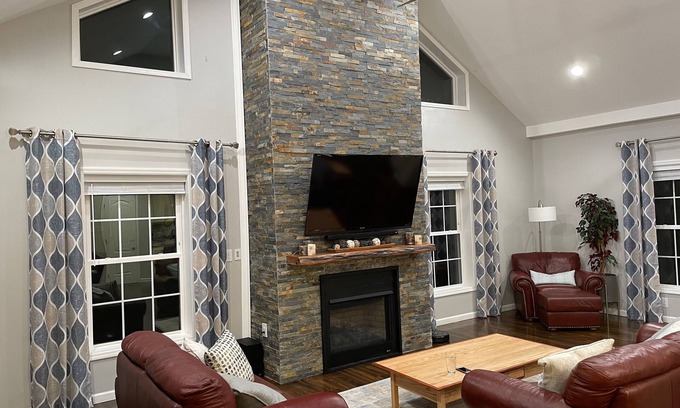 Beautiful brand new custom home situated on 1.5 acres of secluded land. 45 mins from NYC, two miles from train station to NYC, and 1 hour from Jersey Shore. The home has a first floor master suite with walk in closet & bathroom. Upstairs has two bedrooms and bathroom. Finished basement with a movie room, surround sound and reclining sofas. Access to full kitchen and laundry as well as two separate living rooms w/ pull out couch. Super fast WiFi (500+Mbps). No pets allowed.