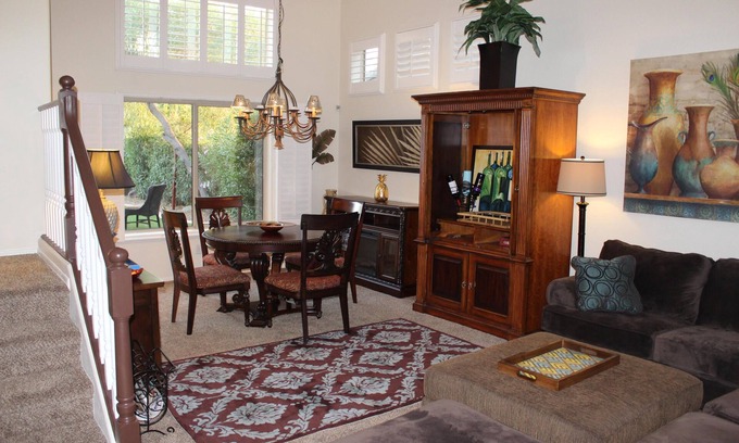 Welcome to our luxurious warm winter getaway near beautiful Dove Valley Ranch & Golf Club. Located next to North Scottsdale. The home is located in a quiet gated upscale gated neighborhood on a cul-de-sac. Our home features vaulted ceilings both upstairs and down. There is a bedroom and a full bath downstairs (which can substitute for a master) and three bedrooms upstairs. This includes the main master with his and hers walk in closets, soaking tub, and shower. The home is very comfortable with luxurious furniture and is decorated to reflect the area’s rich history. It is a perfect place to escape harsh weather from other parts of the nation. Swimming pool has the option of being heated for an additional fee of $175 per week. Added upon request at the time of registration as an additional fee.