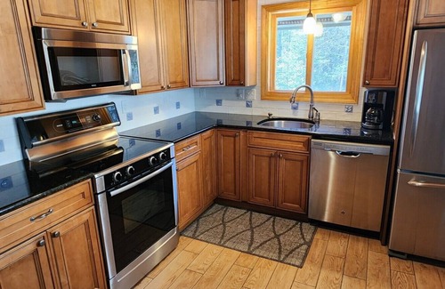 Level One includes a dining area and living area with a local granite wood-burning fireplace. There is a comfortable sofa and chair/ottoman. Also on this level is a full bath and a generous sized newly updated Kitchen with stainless steel appliances, granite counter tops, and all the dishes and utensils you need. Level Two has a front master bedroom with new queen size bed and a balcony that looks out over the ocean and out to the distant flashing lighthouse. The back bedroom has a pine bunk bed with a full size mattress on bottom and a single on top. There is also another single daybed in an adjacent sitting room. A new half bath separates the front and back bedrooms. All these rooms have pine plank ceilings and pine plank walls, new carpeting, and tile.