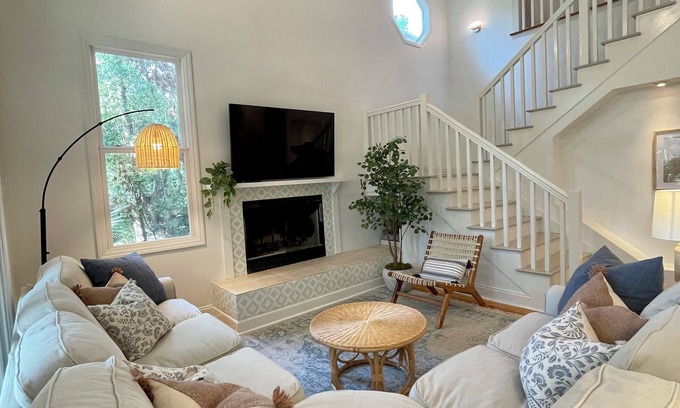 Relax with family and friends at our peaceful Edisto Beach home. Nestled behind a large oak and gorgeous palms, there is a large porch perfect for morning coffee and evening sunsets! Our home sits on a spacious lot with ample outdoor space for yard games. Inside our beach house, you will find vaulted ceilings and an open living concept. Decorated tastefully, it is very cozy and calming! The kitchen is stocked with everything you need to prepare meals!