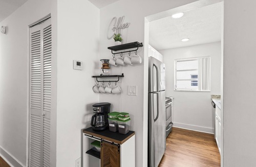 The living room boasts a brand-new couch and a 50'' Smart TV, perfectly paired with the dining area for your convenience. Treat yourself to ultimate relaxation with our complimentary coffee station in every unit at Palm Wave Stays. Whether you're curling up with a book or binge-watching your favorite series, enjoy a delightful caffeine boost for a cozy experience. Coffee lovers, you're in for a treat!