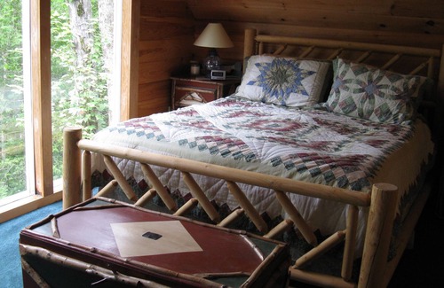 Relax and refresh on a small, serene, pristine lake in Liberty Maine. Our lakeside cabin is a year-round home in the woods, with an open floor plan on the first floor and a master bedroom with floor to ceiling windows overlooking trees and water upstairs, and a second bedroom overlooking the front yard. Our recently remodeled gourmet kitchen is fully equipped with all the comforts of home, including a gas range, dishwasher, microwave, coffee maker and toaster oven, and it opens out to a dining area complete with a big farm table that seats 8. The living room has a large comfy sectional couch with a queen-sized pull out bed, tv/dvd with roku, stereo/cd, a wood stove, AC and propane heater. Two sets of sliding glass doors lead out to our deck, furnished with cushioned outdoor wicker, picnic table and a gas barbecue. The cabin also has wifi, good cell phone reception, a washer/dryer and a queen sized airbed.