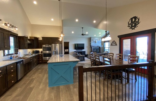 This getaway features a spacious back deck for sunrise or stargazing, a front porch for sunsets, and a fire-pit for cozy evenings. Inside, enjoy the main upstairs great room with floor-to-ceiling windows and a fireplace or the basement living room with TVs, a large sectional, and a table for games. A Sonos sound system adds to the entertainment.